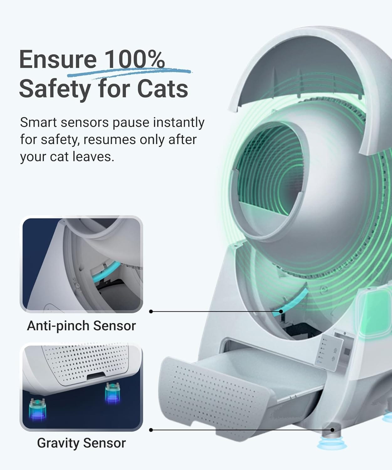 - Equipped with advanced radar and infrared sensors to detect nearby cats, pausing the cleaning process instantly if someone is inside.