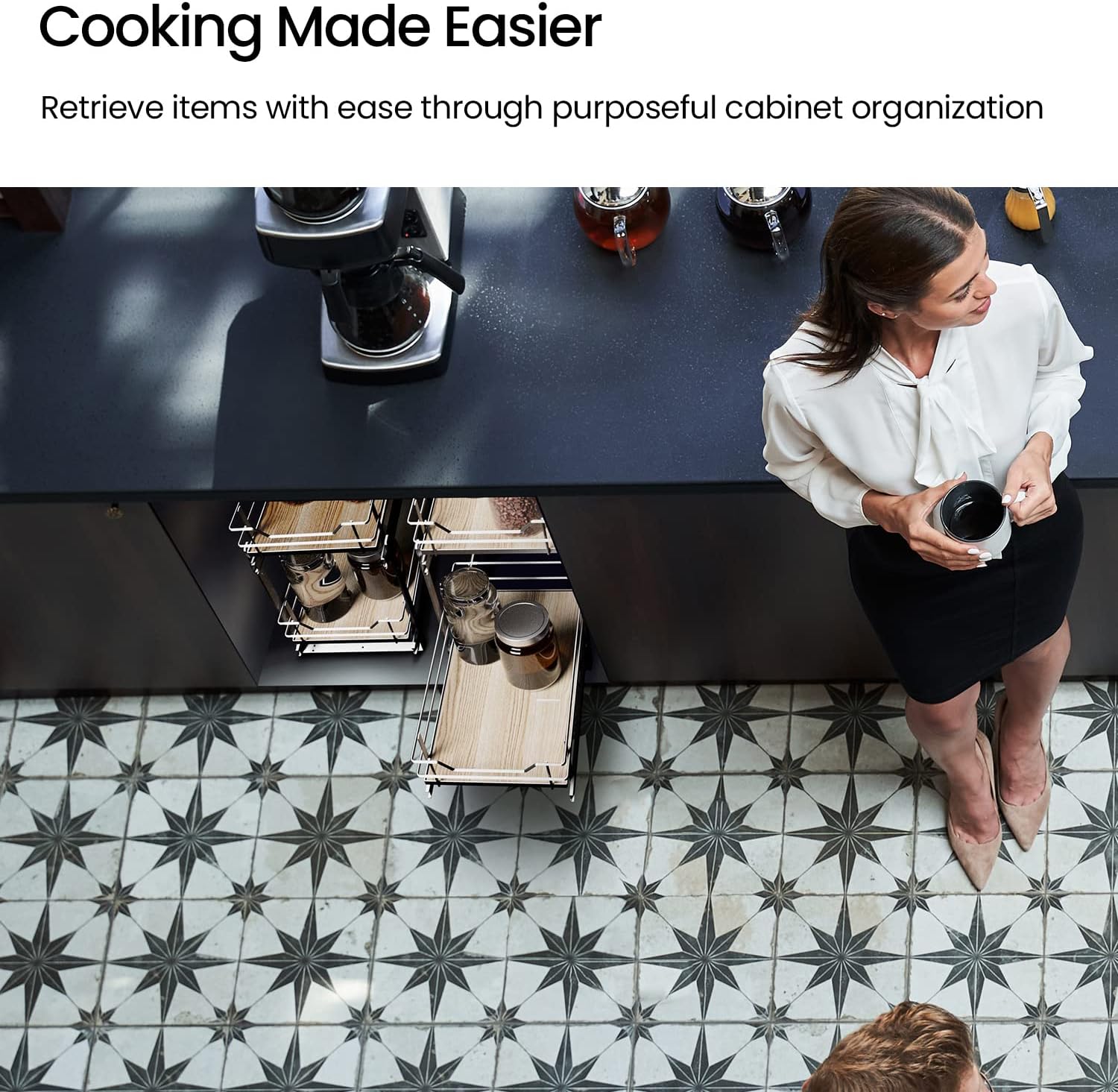 Home Zone Living Pull-Out Kitchen This organizer is perfect for homeowners who want to save time, maximize cabinet space, and maintain a neat kitchen. It reduces the frustration of reaching for items at the back of cabinets and ensures everything is easily accessible. Customers appreciate the durable construction, smooth sliding system, and versatile two-tier design.