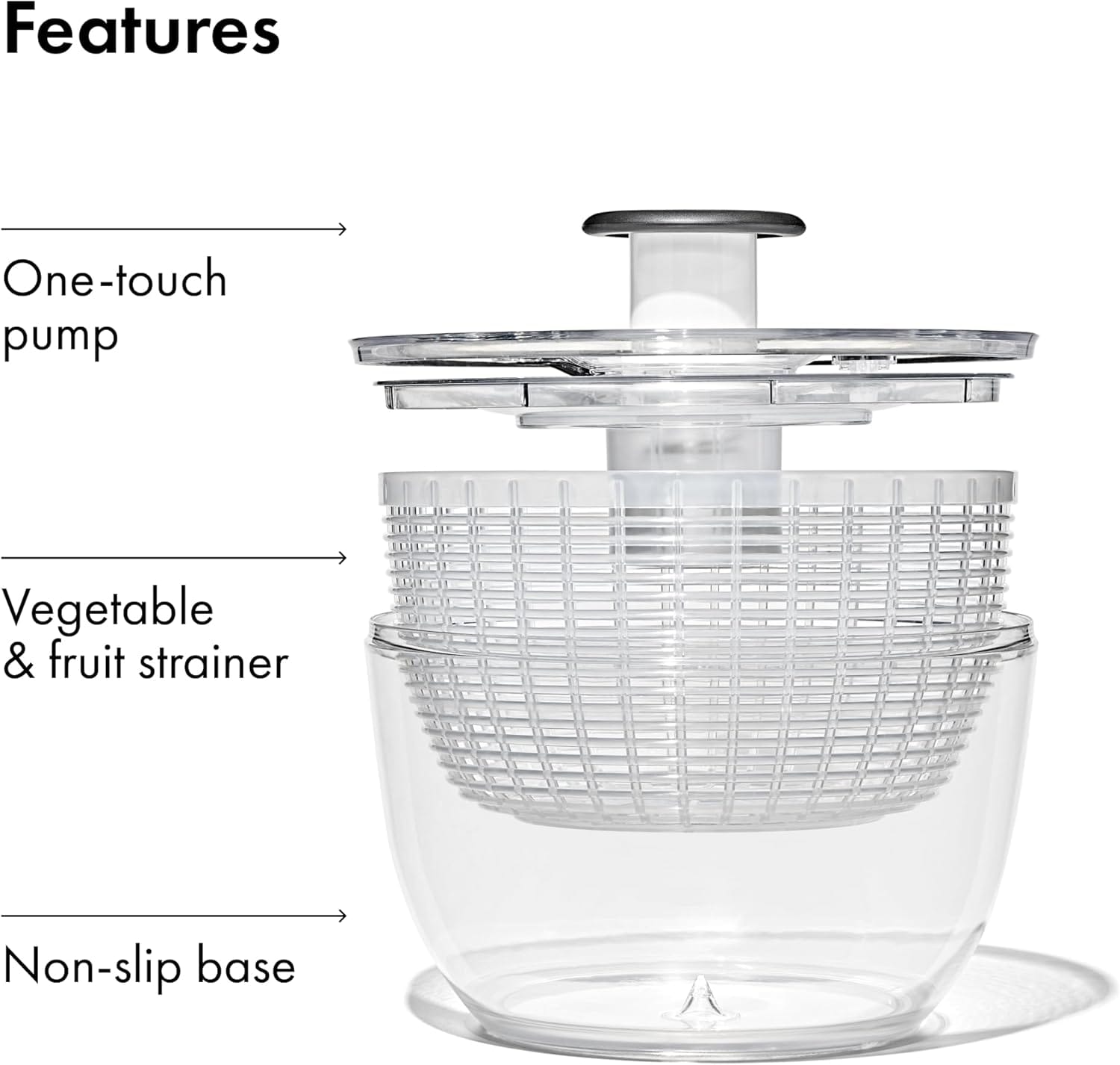 The OXO Good Grips Salad Spinner makes washing and drying greens fast and effortless. Its soft, non-slip pump mechanism spins quickly to remove water while protecting delicate leaves. The built-in brake button stops spinning instantly for easy unloading. The basket doubles as a colander for rinsing and draining in one step. A non-slip base ensures stability during use, and the lid disassembles for thorough cleaning. The durable, clear bowl can also serve as a serving dish, combining convenience and functionality in a single kitchen tool.