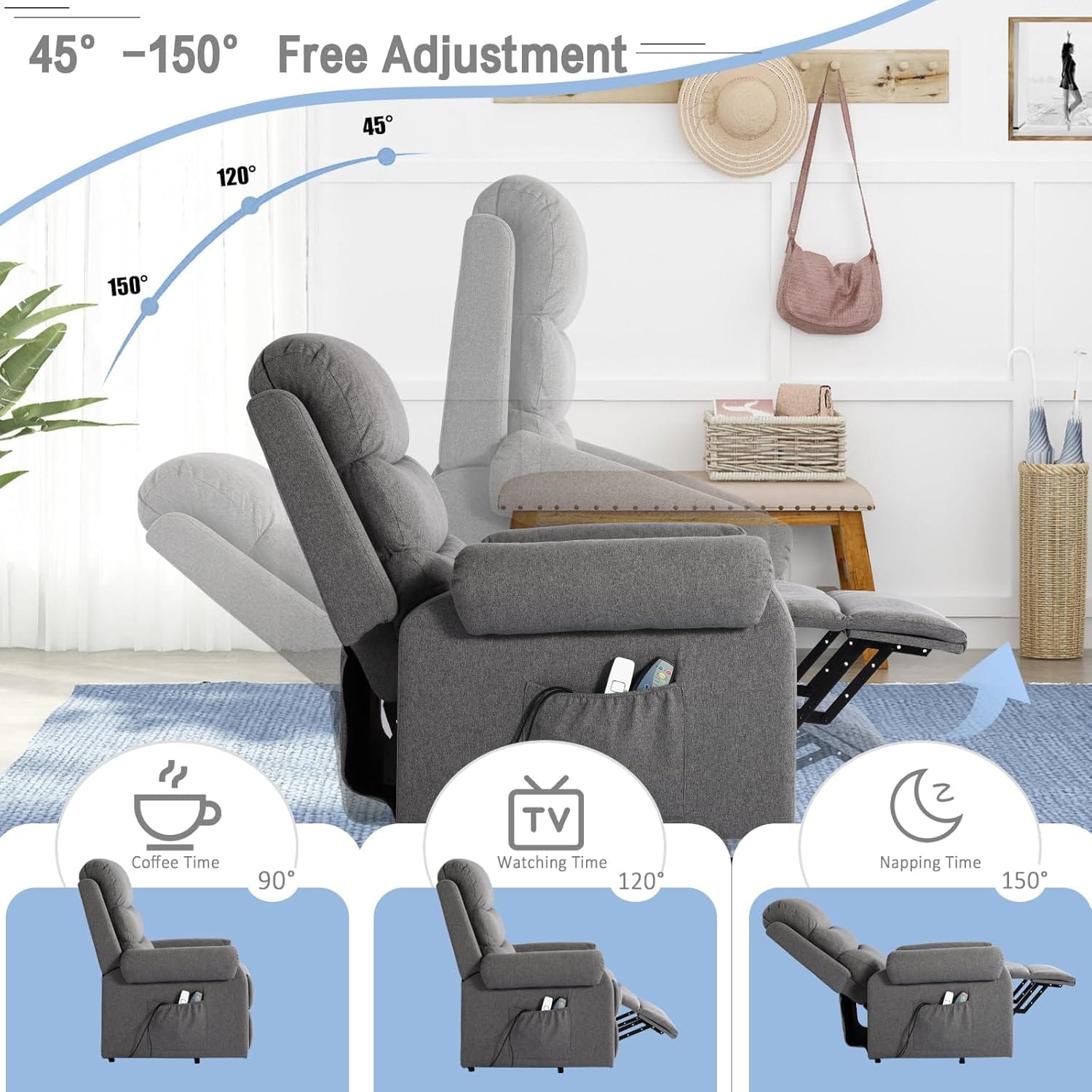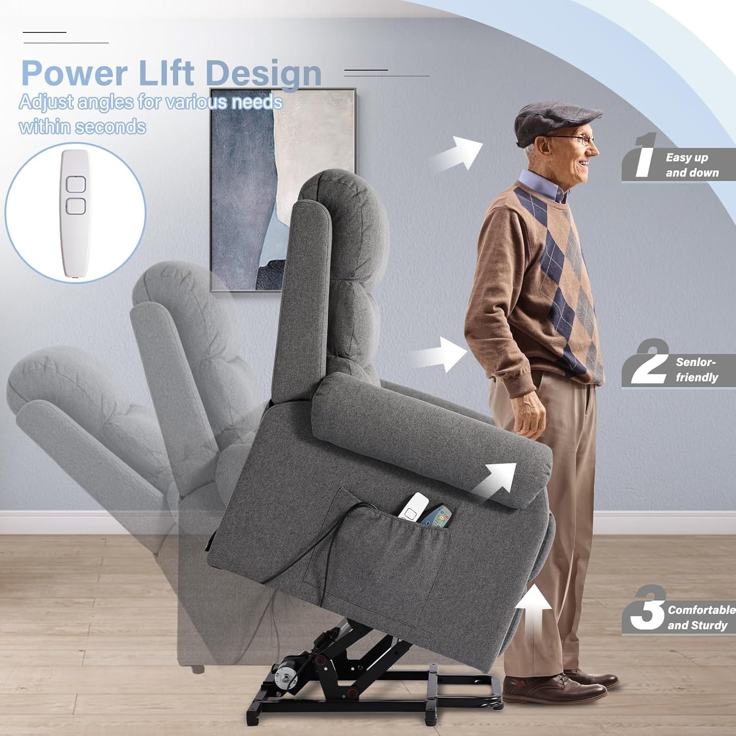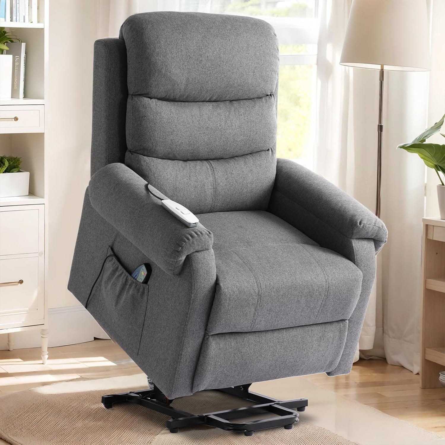 The SENIFIS Power Lift Recliner Chair is a versatile and stylish seating solution designed to enhance comfort and support for individuals with mobility challenges. Crafted with high-quality linen fabric, this chair blends seamlessly into any home décor, offering both functionality and elegance. It features a powerful electric motor that gently lifts and tilts the chair forward, assisting users in standing up effortlessly, making it ideal for seniors or those recovering from surgery. The integrated massage and heat functions provide soothing relief to the back, lumbar, and thighs, promoting relaxation and alleviating muscle tension. An easy-to-use remote control allows precise adjustment of the chair’s position and activation of massage or heat settings. Built with a durable wooden frame and high-density foam, the chair ensures long-lasting support and comfort. Its compact design fits perfectly in smaller spaces such as bedrooms or apartments, providing maximum comfort without occupying too much room. The SENIFIS Power Lift Recliner combines practicality, comfort, and style for a superior relaxation experience.